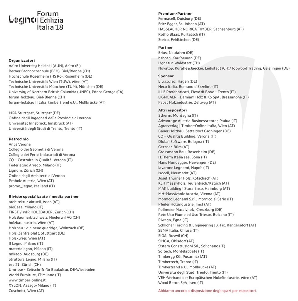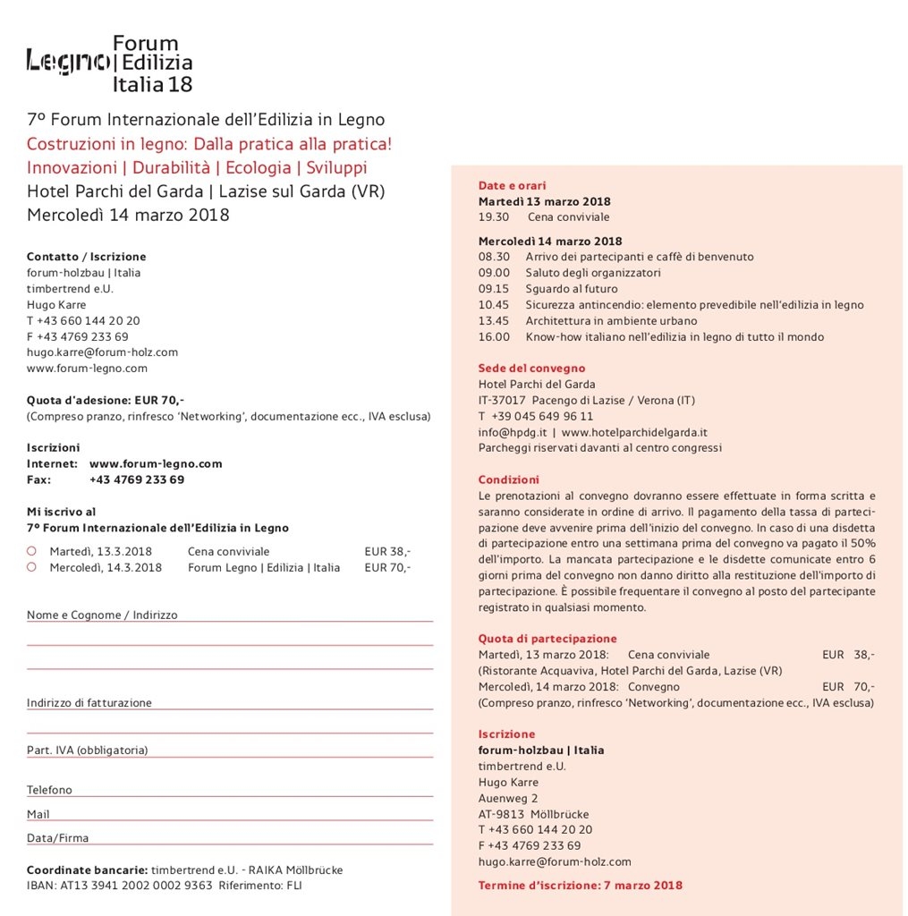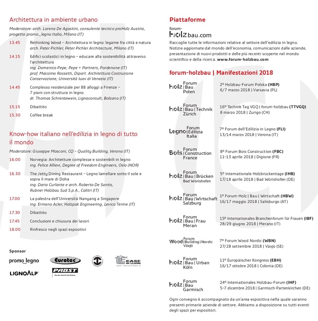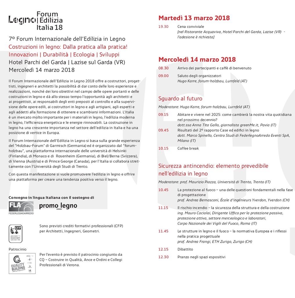 Il Forum Internazionale dell’Edilizia in Legno 2018 offre a costruttori, progettisti, ingegneri e architetti la possibilità di dar conto delle loro esperienze e realizzazioni, nonché dei loro obiettivi nel campo delle opere portanti e delle costruzioni in legno e dà allo stesso tempo l’opportunità agli architetti e ai progettisti, ai responsabili degli enti preposti al controllo e alla supervisione delle opere edili, ai costruttori in legno e agli artigiani, agli esperti e agli addetti alla formazione di ottenere e scambiarsi informazioni.