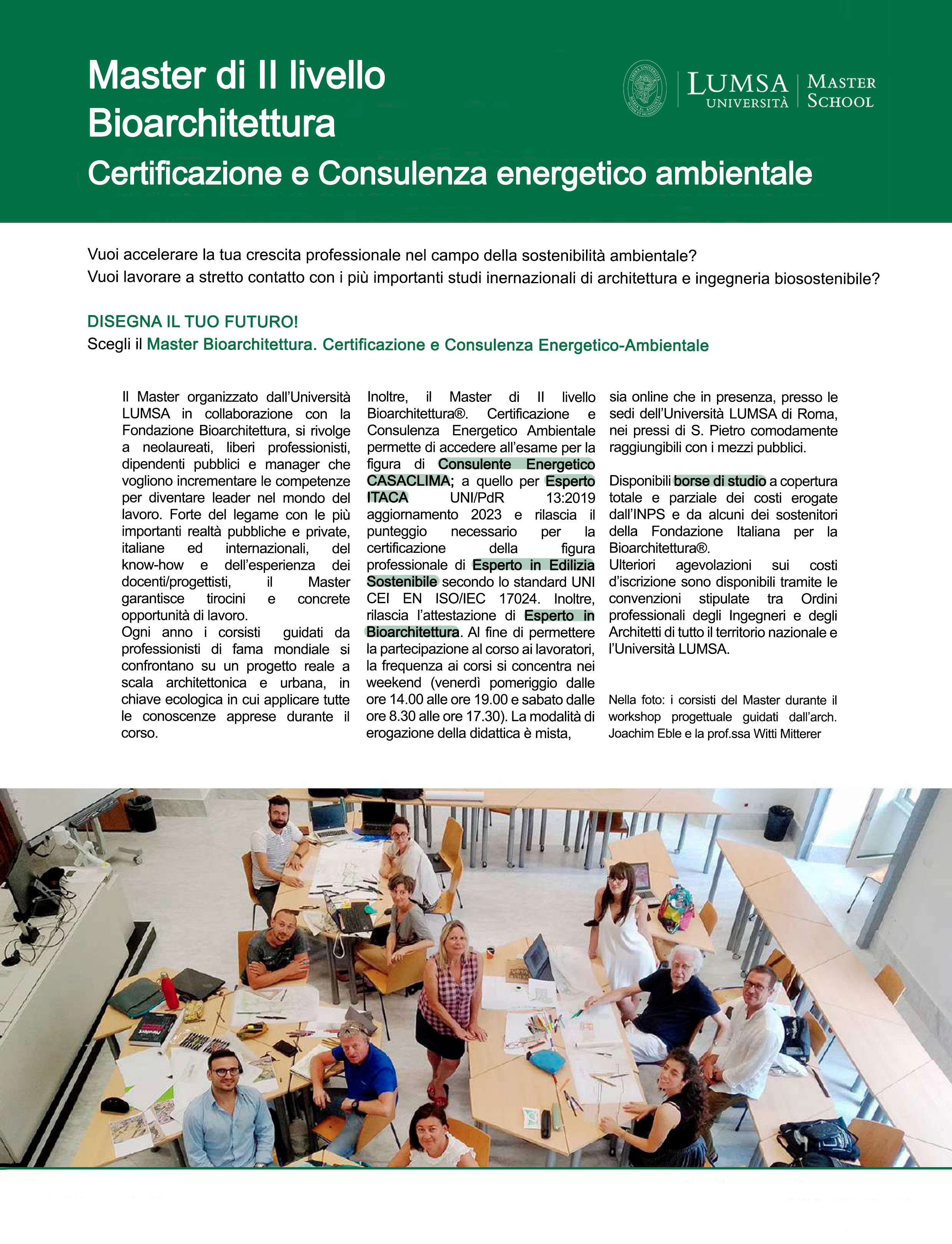 II Master organizzato dall’Università LUMSA e dalla Fondazione Bioarchitettura in collaborazione con l’Agenzia CasaClima di Bolzano e Itaca si rivolge a neolaureati, liberi professionisti, dipendenti pubblici e manager che vogliono incrementare le competenze per diventare leader nel mondo del lavoro.